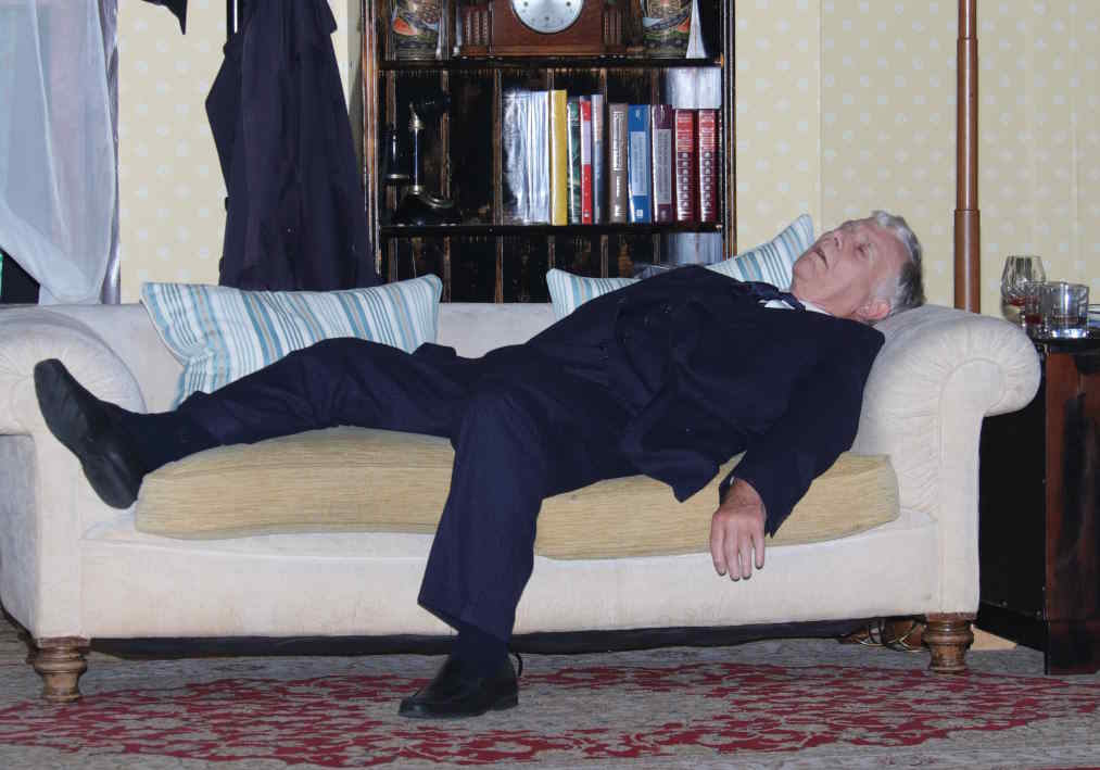 Then everyone goes off in a huff, leaving Walter to drink the doctored Scotch, eat a lettuce leaf, and collapse in a heap on the sofa – as good as dead!