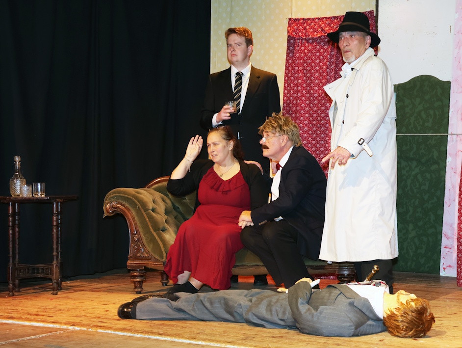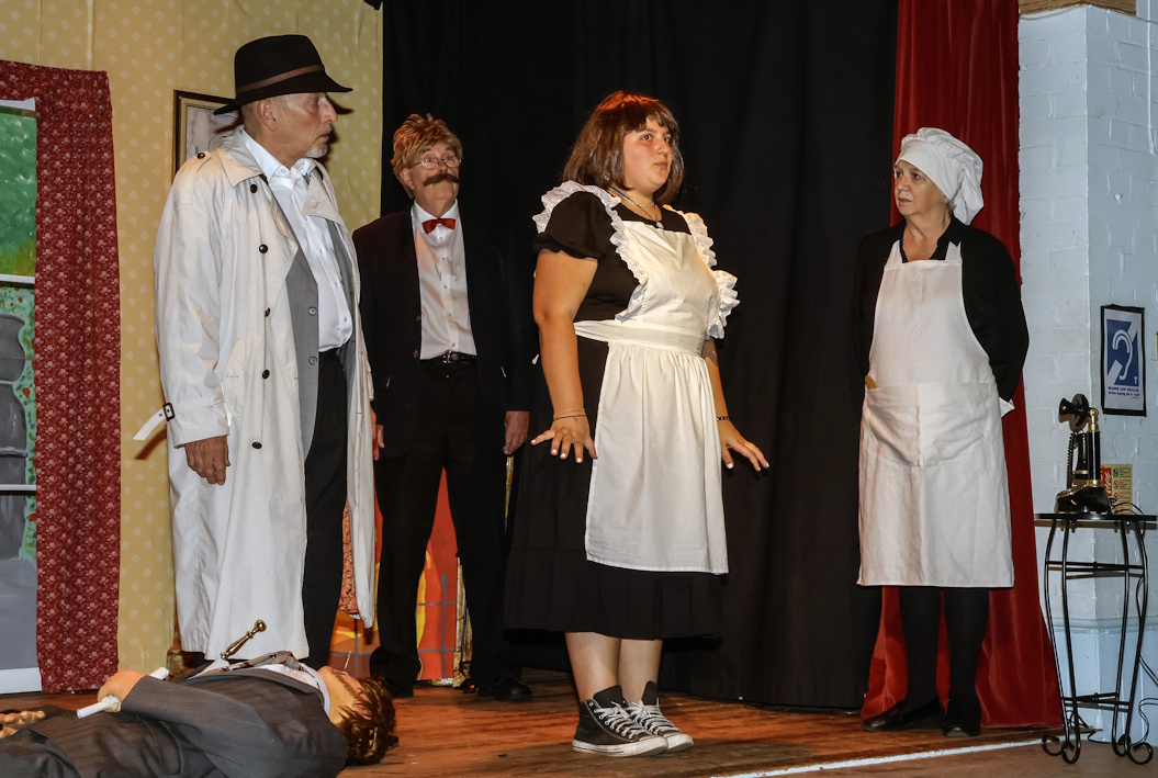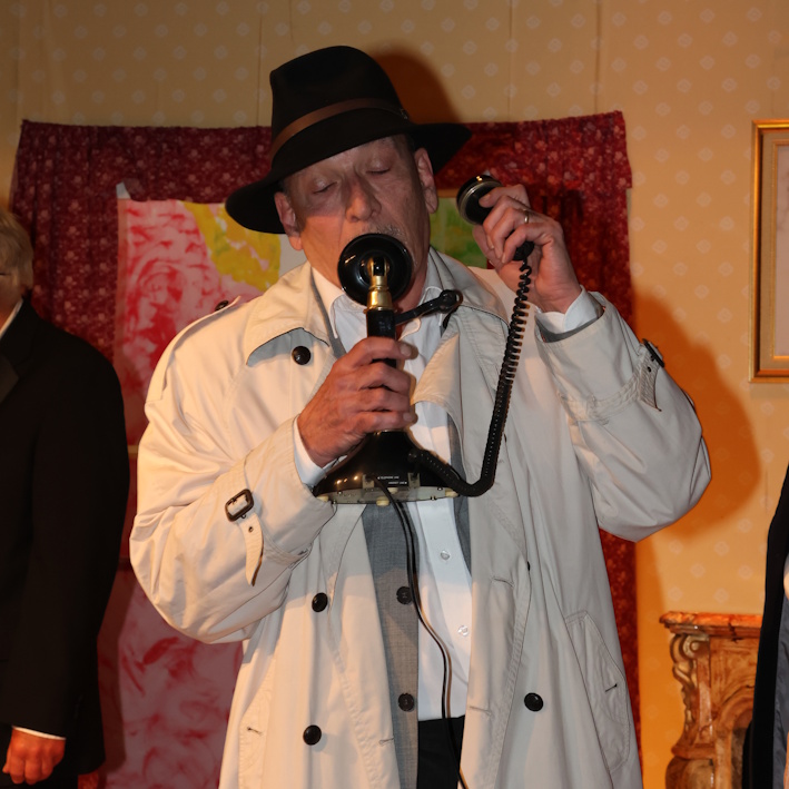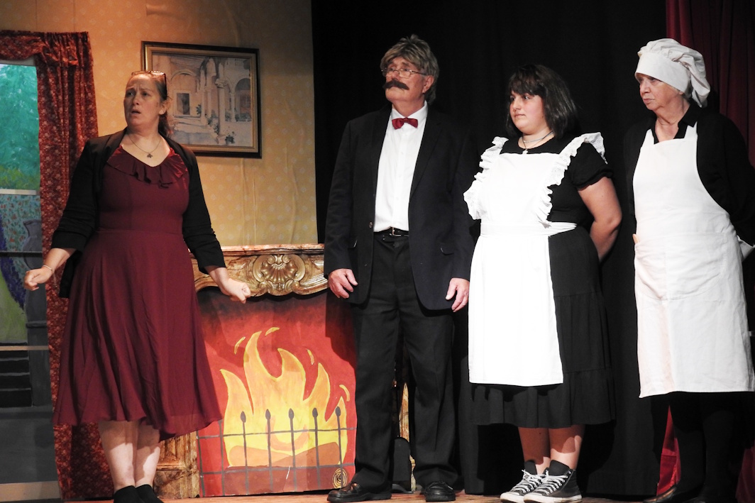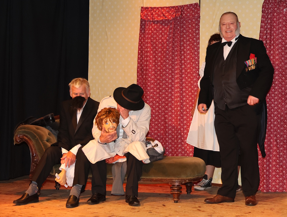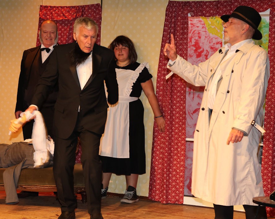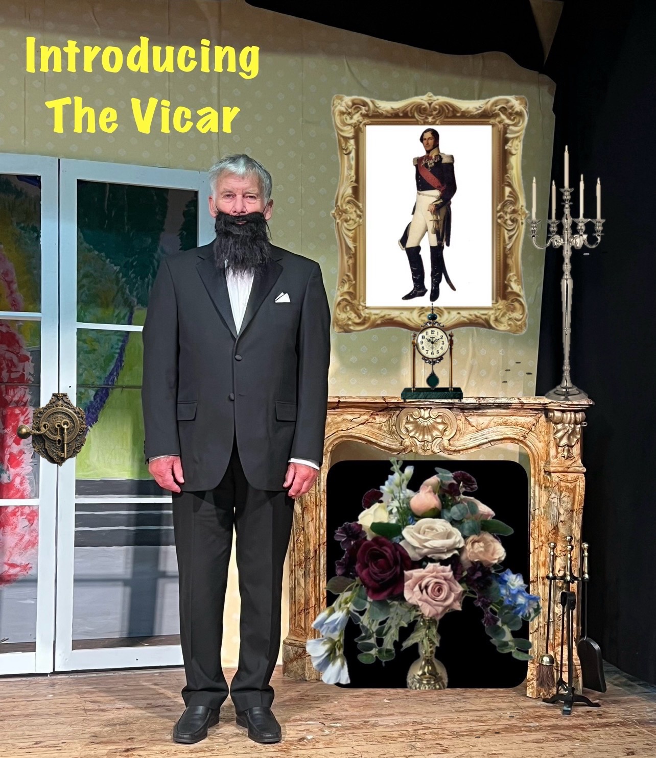 The Vicar (Jo Smith) with a great black beard arrives, though not through the French windows as intended – he has to burst through the fireplace (sadly we didn’t get a shot of this) – and note the maid is now holding up the mobile flat.