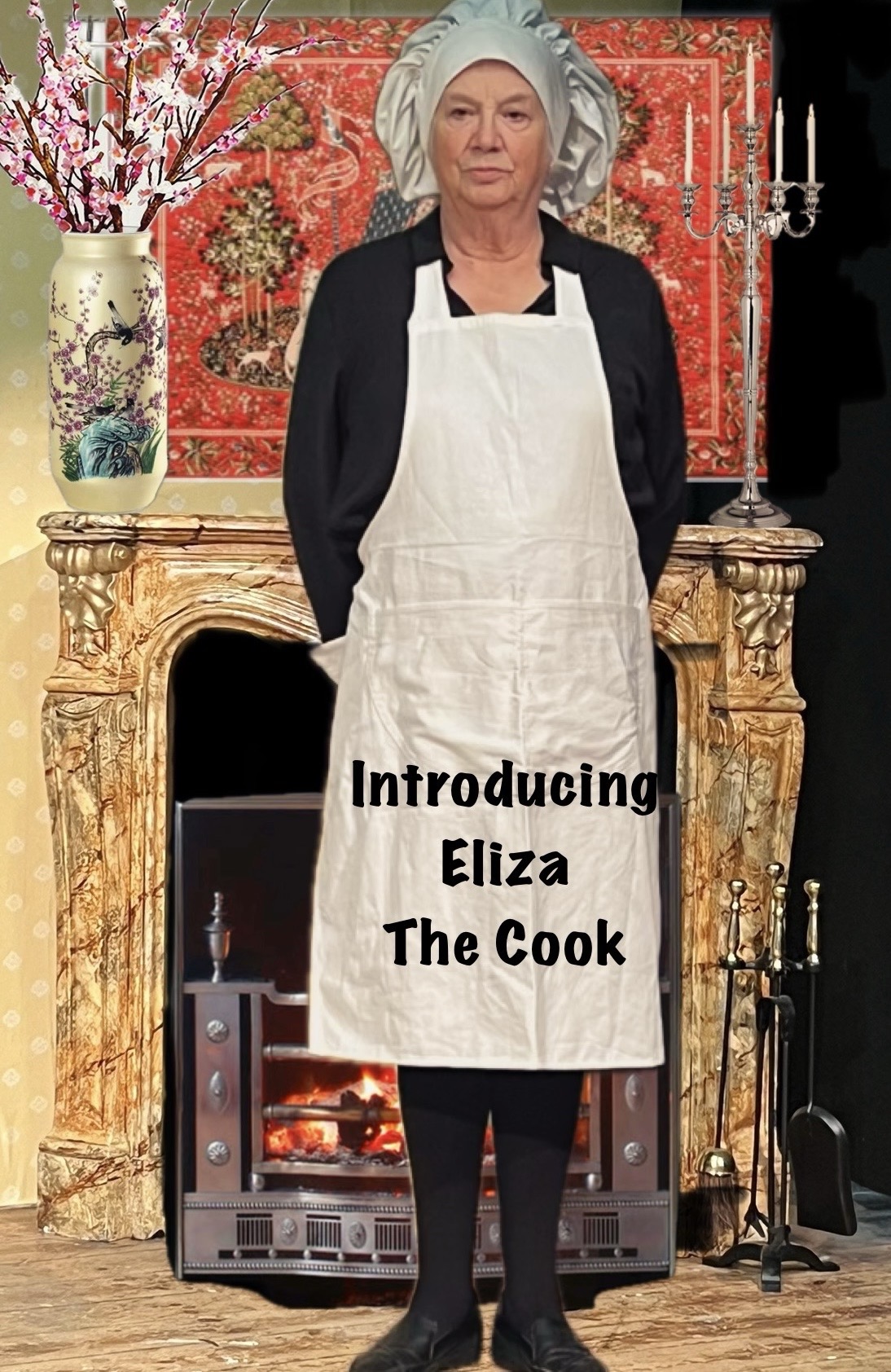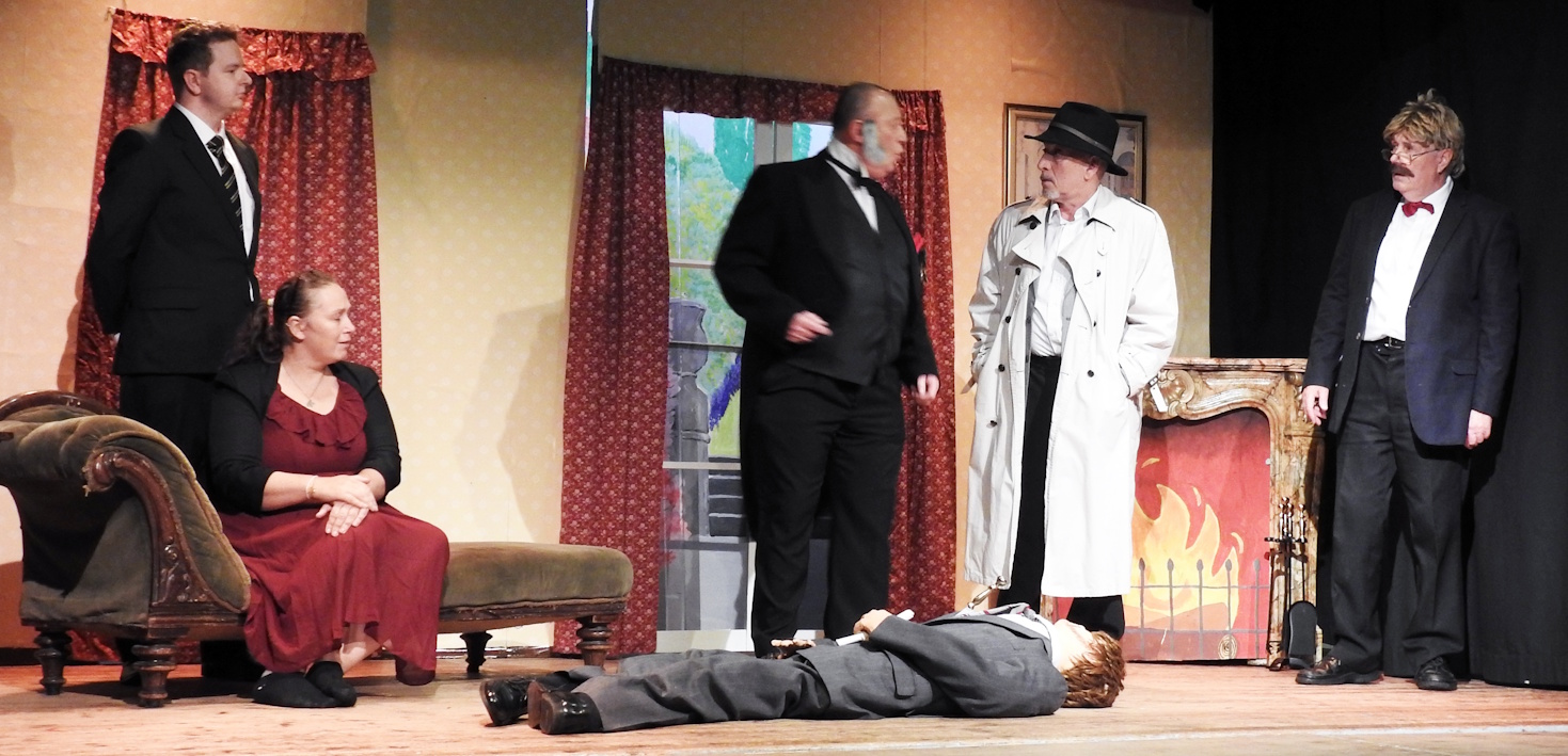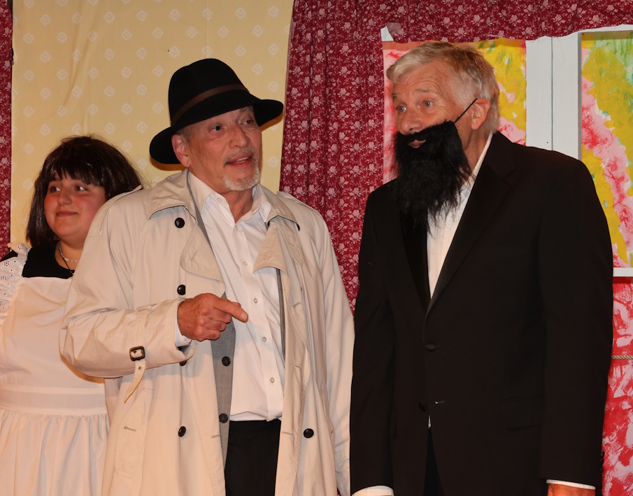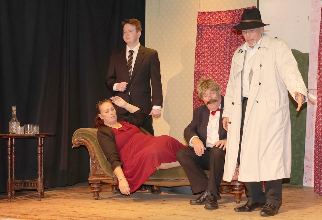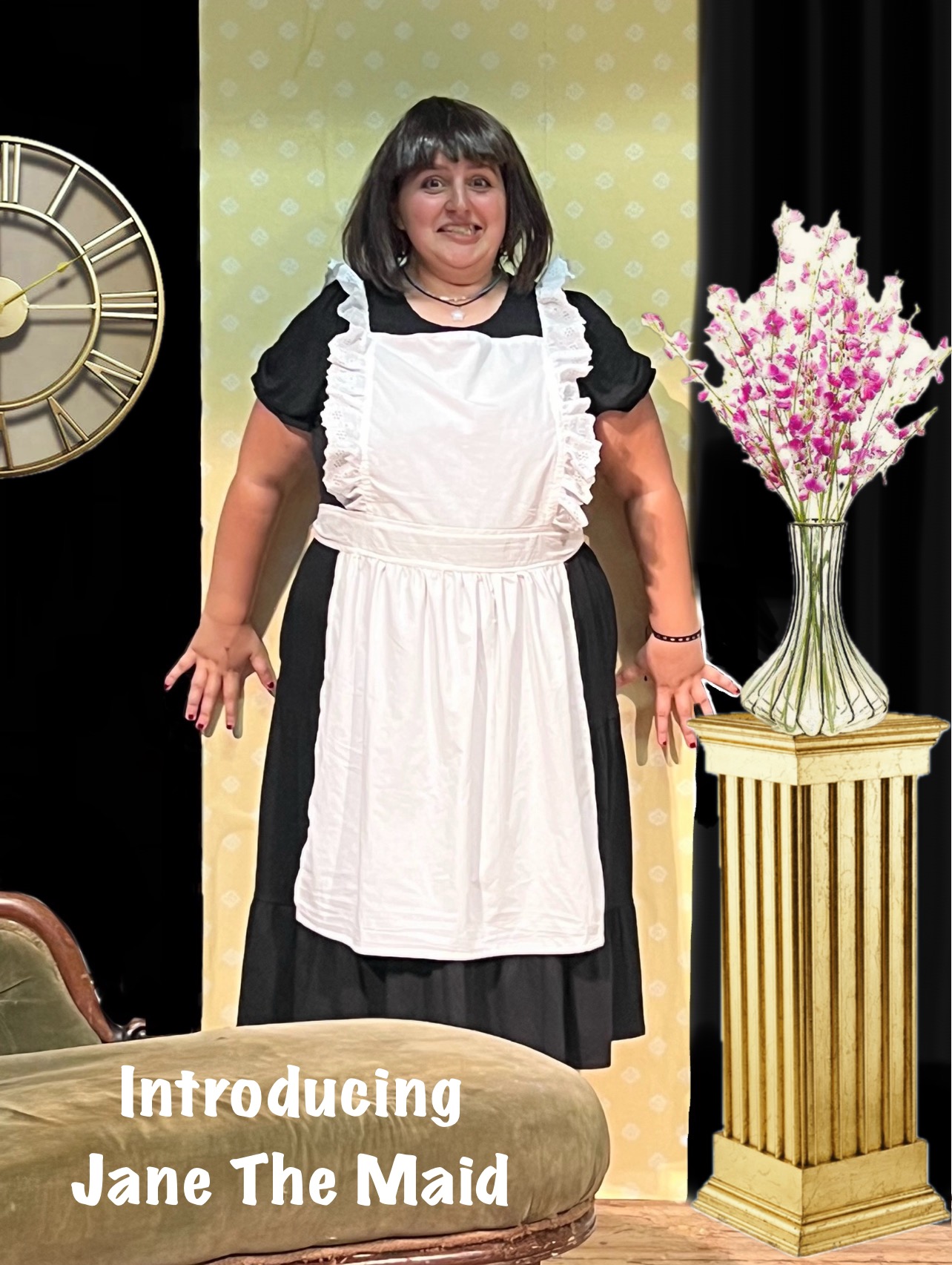 The Vicar (Jo Smith) with a great black beard arrives, though not through the French windows as intended – he has to burst through the fireplace (sadly we didn’t get a shot of this) – and note the maid is now holding up the mobile flat.