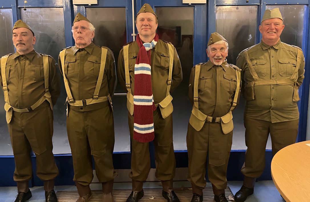 The platoon line up in the entrance hall ready to march up to the stage – L to R: Pte Walker (Mike Pennick), Pte Godfrey (David Irwin), Pte Pike (Rufus Kendall), Cpl Jones (Neil Hardinge) and Pte Frazer (Martin Wellen).