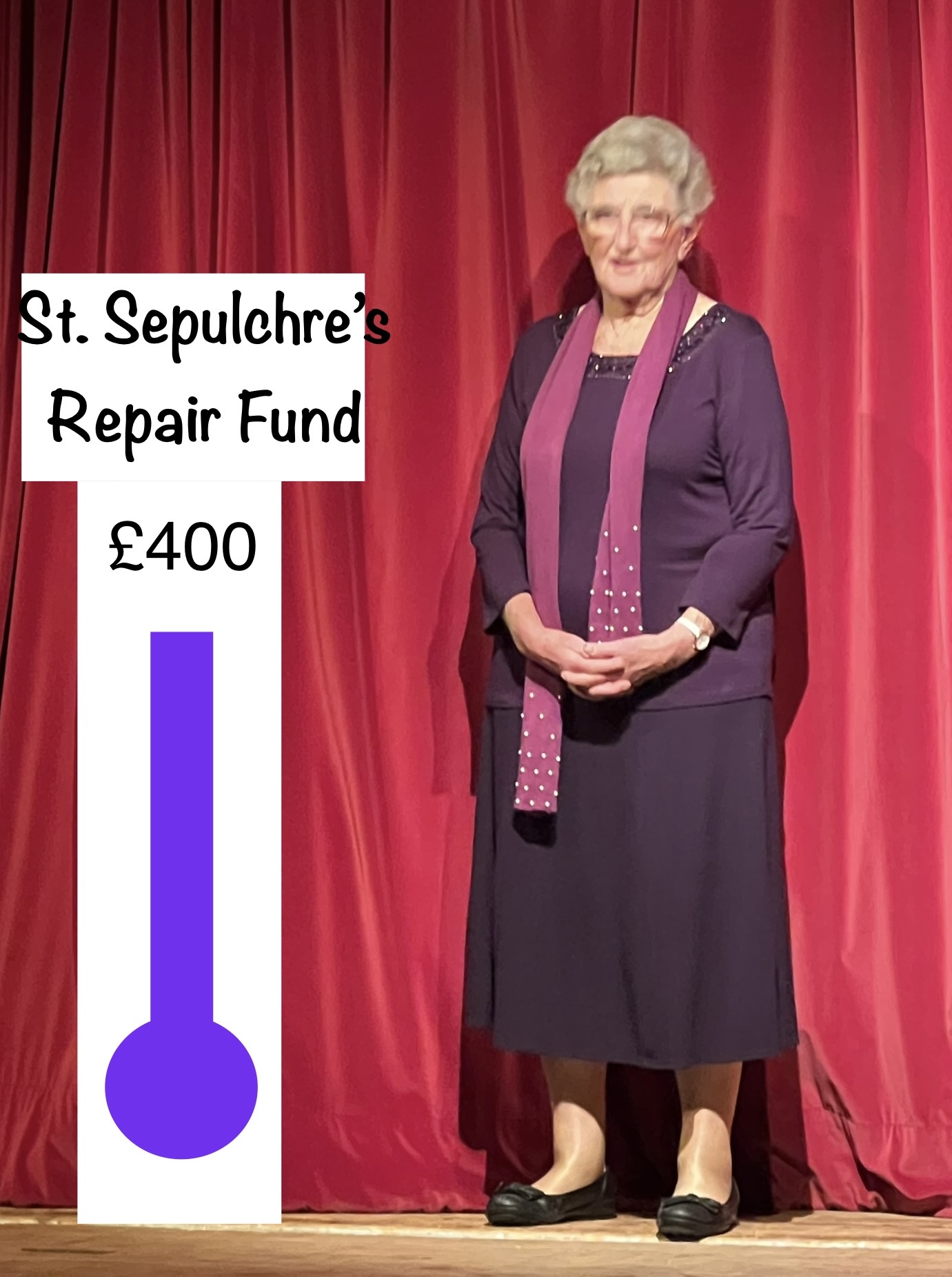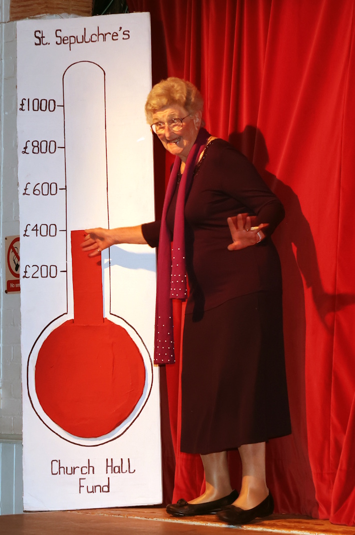 Angela Berry opens proceedings, manipulating the misbehaving ‘thermometer’ showing money so far collected for church funds.