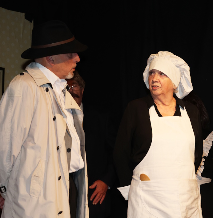 The maid (Annaliese Farnlucher) gives evidence with the Cook (Mavis Standing) looking on.